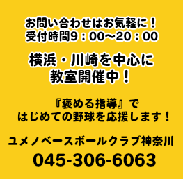 ユメノベースボールクラブ神奈川は、『褒める指導』、『遊び要素を取り入れた練習メニュー』で、野球の楽しさを学んでいただくクラブです。